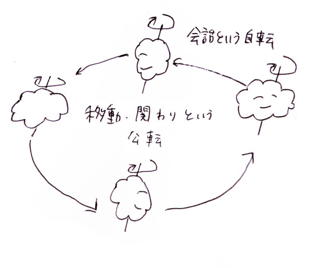 しかし、会話の内容は循環し、発言の中で役割が移り変わる。彼らは個人を特別にすることも卑屈に扱うこともせずただ等置する。活動のなかで出会った人と話し、作品や展示を作り、その中で、ただ3人の輪を回転させ続ける。